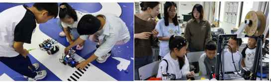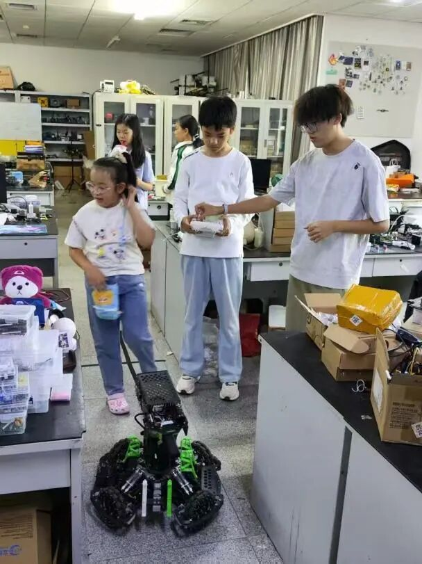 在电控联合实验室,小朋友们认识了正在备战Robot Master机器人大赛的学长学姐们。实验室里,几辆威风凛凛的装甲机器人车整齐陈列,金属质感的车身、灵活转动的机械臂,瞬间抓住了孩子们的目光。随后,小朋友们还陆续走进智能车实验室与无人机实验室。智能车实验室内,灵活穿梭的智能小车成为全场焦点,小朋友们不仅近距离观察了小车的构造,还在学长和老师的指导下尝试操控,体验“指挥”科技的乐趣;无人机实验室更是将活动气氛推向高潮,当无人机伴随着嗡鸣腾空而起、完成悬停、旋转等一系列动作时,孩子们兴奋地挥舞小手,眼中满是对科技的向往。